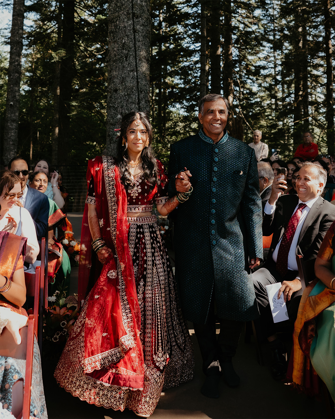 As the day unfolded, sunlight filtered through the evergreens, creating a warm, golden glow over the entire space. Sandia and Reuben’s traditional Indian wedding ceremony was filled with emotion, blending cultural traditions with personal touches that made it uniquely theirs.